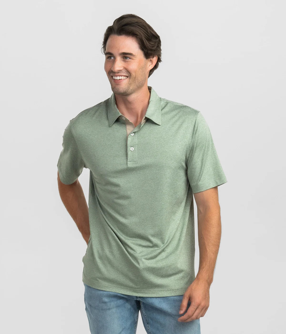 Experience unrivaled style in our course-ready performance polos. Crafted from heathered jersey knit; they're the ultimate blend of comfort and style providing 4-way stretch and quick-drying properties. Brandon is 6’0” and is wearing a medium.